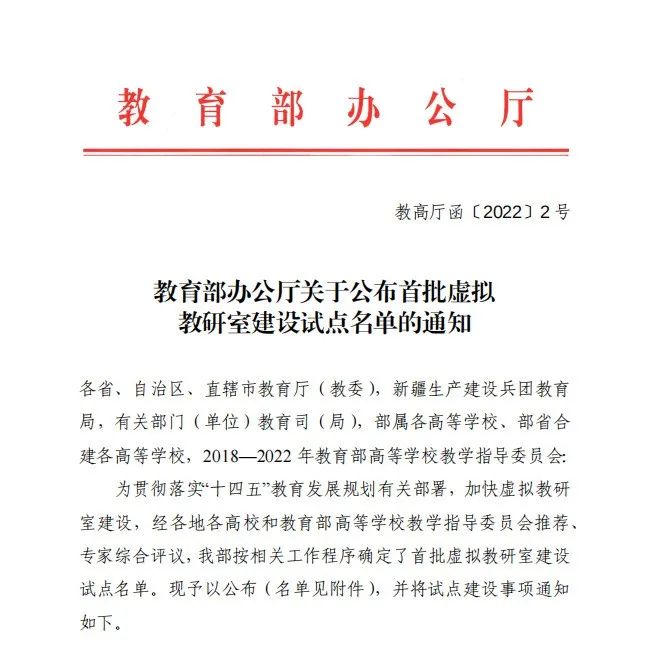 近日,教育部办公厅公布首批虚拟教研室建设试点名单,我校4个虚拟教研室获批,位居全省第一,新葡京娱乐