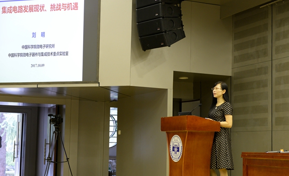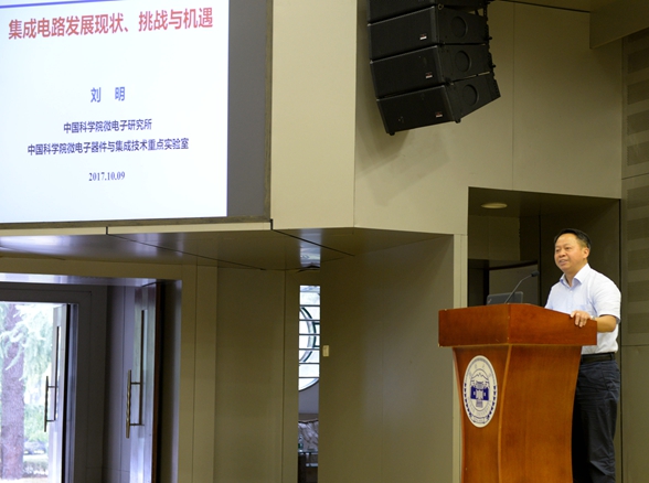 2017年10月9日,应化学生物传感与计量学国家重点实验室谭蔚泓主任邀请,中国科学院微电子研究所刘明院士来实验室进行学术讲座。湖南大学段献忠校长主持学术讲座,对刘明院士的到来表示热烈欢迎,我室两百多名师生代表聆听了此次讲座,逸夫楼报告厅内座无虚席。刘明院士就我国集成电路60年的发展沿革、集成电路制造业现状及面临的挑战、未来集成电路进一步发展趋势进行了深入浅出的讲解,赢得了在场所有听众的阵阵掌声。报告会后,刘明院士与部分老师、研究生进行座谈,对师生们提出的问题进行了耐心细致的解答,特别结合自身职业历程和丰富的生活经验,为女性科研工作者如何解决科研、生活、家庭的矛盾提供了许多有益的借鉴。