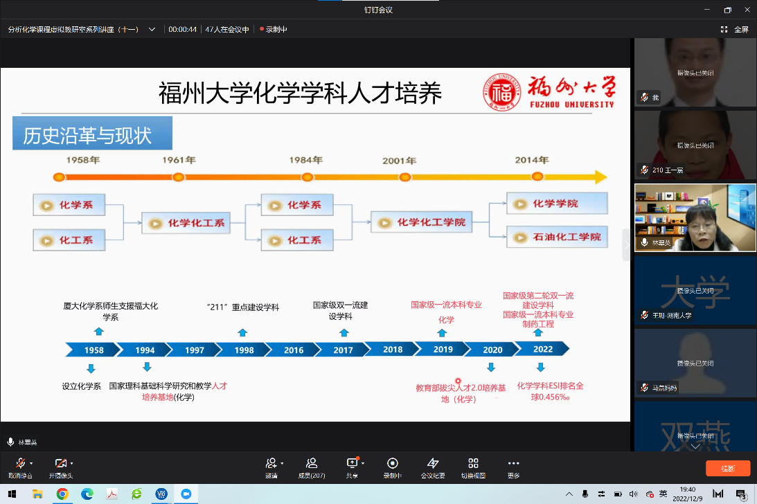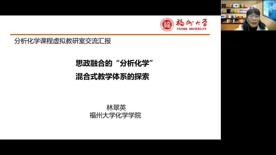 2022年12月9日,分析化学课程虚拟教研室举行了第十一期讲座,由湖南大学宦双燕教授主持,来自福州大学的林翠英老师为主讲嘉宾。林翠英老师是国家线上一流本科课程《分析化学》和福建省线上线下混合式一流课程《分析化学J》的课程负责人,她报告的题目是“思政融合的‘分析化学’混合式教学体系的探索”,参与本次虚拟教研室交流的有来自十余所高校的六十多位教师。林老师从福州大学化学学科人才培养、“分析化学”课程建设目标、混合式教学设计及实施、混合式教学成果四个方面做了详细报告。对“C3H3嘉锡教育理念”,即清醒的头脑(Clear Head),灵巧的双手(Clever Hands),整洁的习惯(Clean Habit)做了深入阐述,介绍了如何面向“C3H3”化学创新人才培养进行课程体系的建设,从基础知识、深度知识和广度知识三方面构建模块化知识体系,将线上教学资源融入线下教学过程管理中,将思政元素融入到教学内容中。教学中引入公共安全事件案例,培养学生的学科和专业使命感,同时让学生了解学院的科研创新成果为国家和社会做出的贡献,提升学生的自豪感。随后,林老师和与会教师做了教学经验的互动讨论,思政融合的“分析化学”混合式教学体系探索为化学学科创新人才培养提供了好的建设思路和借鉴经验。
