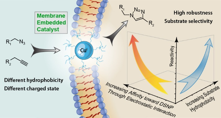 嵌在细胞膜上的催化剂的工作示意图。右侧的3D图展示了该催化剂的催化特性:底物与催化剂的库伦亲和力或疏水亲和力越强,催化效果越好。