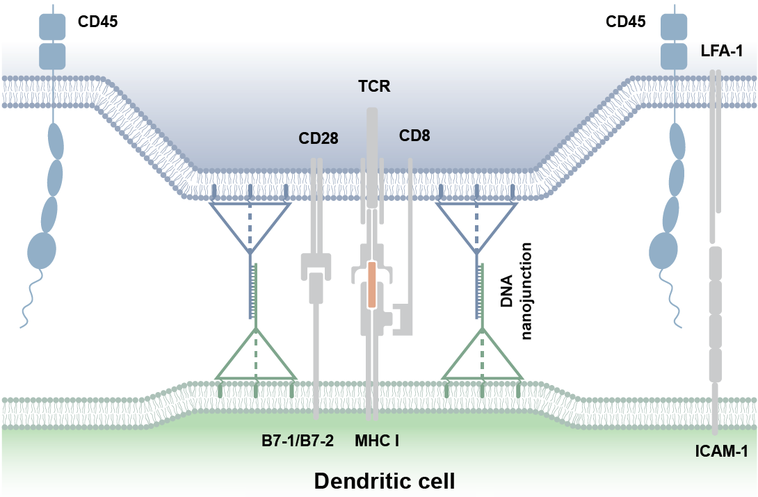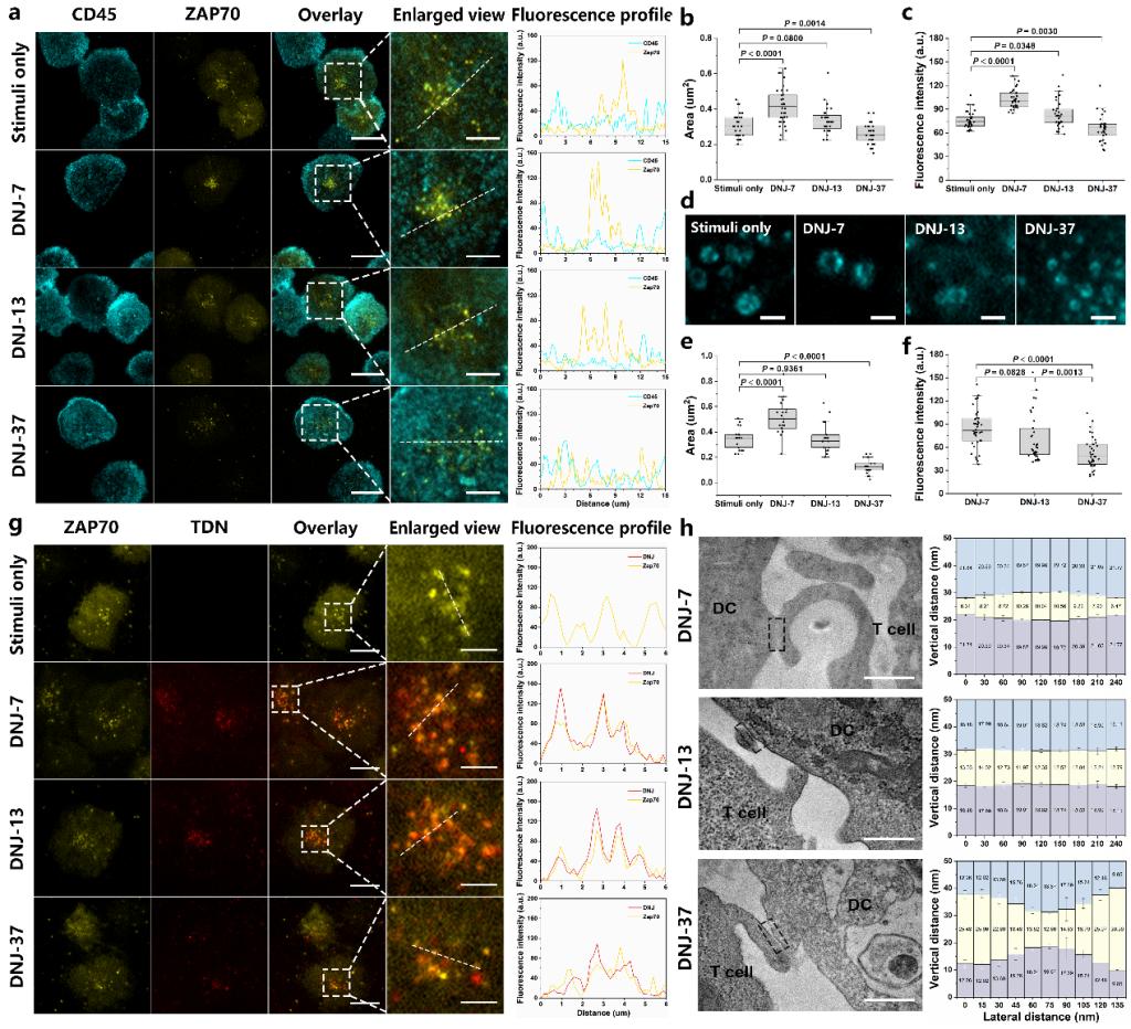 基于这种可编程的膜锚定DNA纳米平台,该研究首次在真实的DC-T细胞相互作用体系中,实现了TCR-pMHC周围紧密接触区轴向空间距离的精准测量和调控。该研究表明在临界低表面密度下,尺寸超过TCR-pMHC复合物尺寸的DNJ-37可以通过延长膜间距离削弱CD45分离来抑制T细胞激活信号,小尺寸的DNJ-7能够压缩DC-T细胞界面处的膜间间隔,并通过导致CD45严格外排和TCR构象改变实现T细胞活化的强烈增强。这些研究结果为紧密接触区的轴向尺寸在T细胞触发中的重要作用提供了直接证据,并且通过缩短DC-T细胞界面可以显著增强T细胞活化水平,为T细胞免疫研究拓宽了窗口。此外,该研究开发的膜锚定DNA纳米平台,具有高可编程性、高可控性、方便操作和良好的生物相容性等优势,有望为细胞-细胞相互作用过程中的分子事件研究提供新范式。
