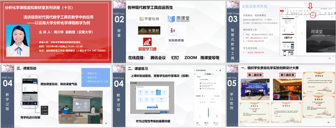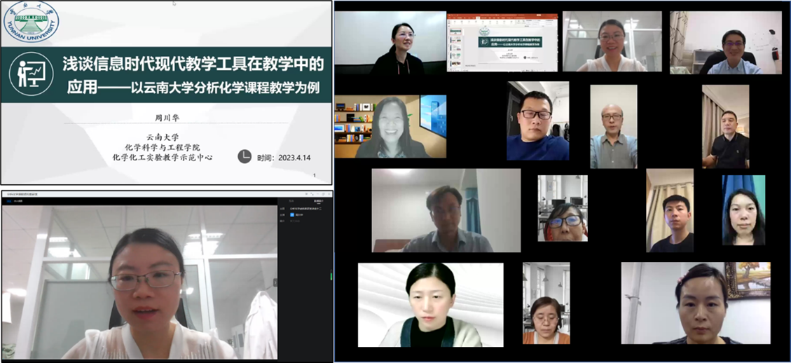 414日,分析化学课程虚拟教研室举行了第十三期讲座,由宦双燕教授主持,云南大学的周川华副教授为主讲嘉宾,她报告的题目是:浅谈信息时代现代教学工具在教学中的应用——以云南大学分析化学课程教学为例,四十多位教师参与了线上会议交流,还有三十多位教师观看了教研直播。