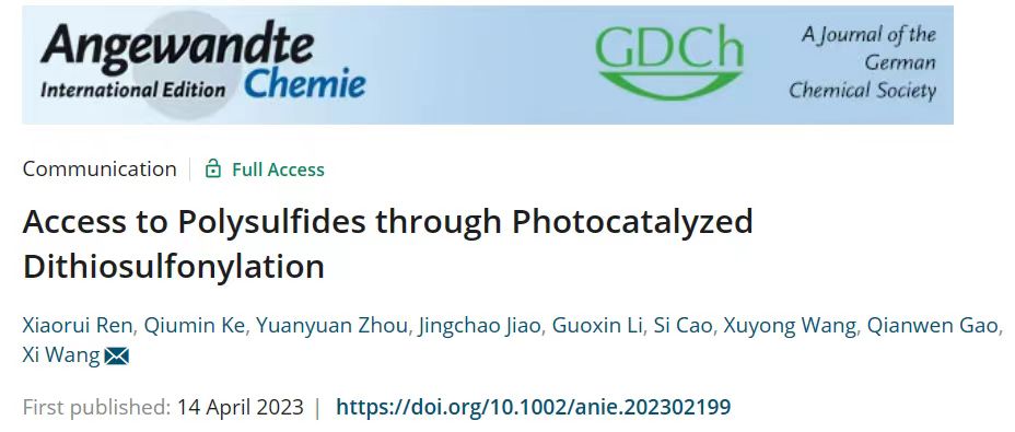 王兮教授团队利用光致氧化还原策略实现了多种不饱和烃和张力环烷烃的连二硫磺酰化反应,并发明了一种新型亲核连二硫化试剂,实现了多种亲电试剂的亲核连二硫化反应。这种新试剂可以利用苯乙烯的连二硫磺酰化反应高效制备。相关成果以“Access to Polysulfides through Photocatalyzed Dithiosulfonylation”为题发表在国际高水平期刊德国应用化学《Angewandte Chemie International Edition》上。