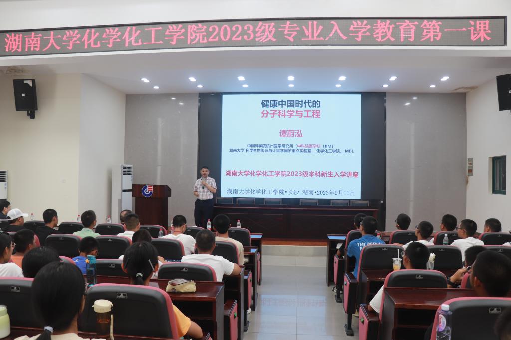 新生入学教育第一课在新化工楼D区报告厅举行。中国科学院院士谭蔚泓作“健康中国时代的分子科学与工程”主题讲座。院长张晓兵出席,院党委副书记李洪玉主持,250余名2023级本科新生参加入学教育第一课。