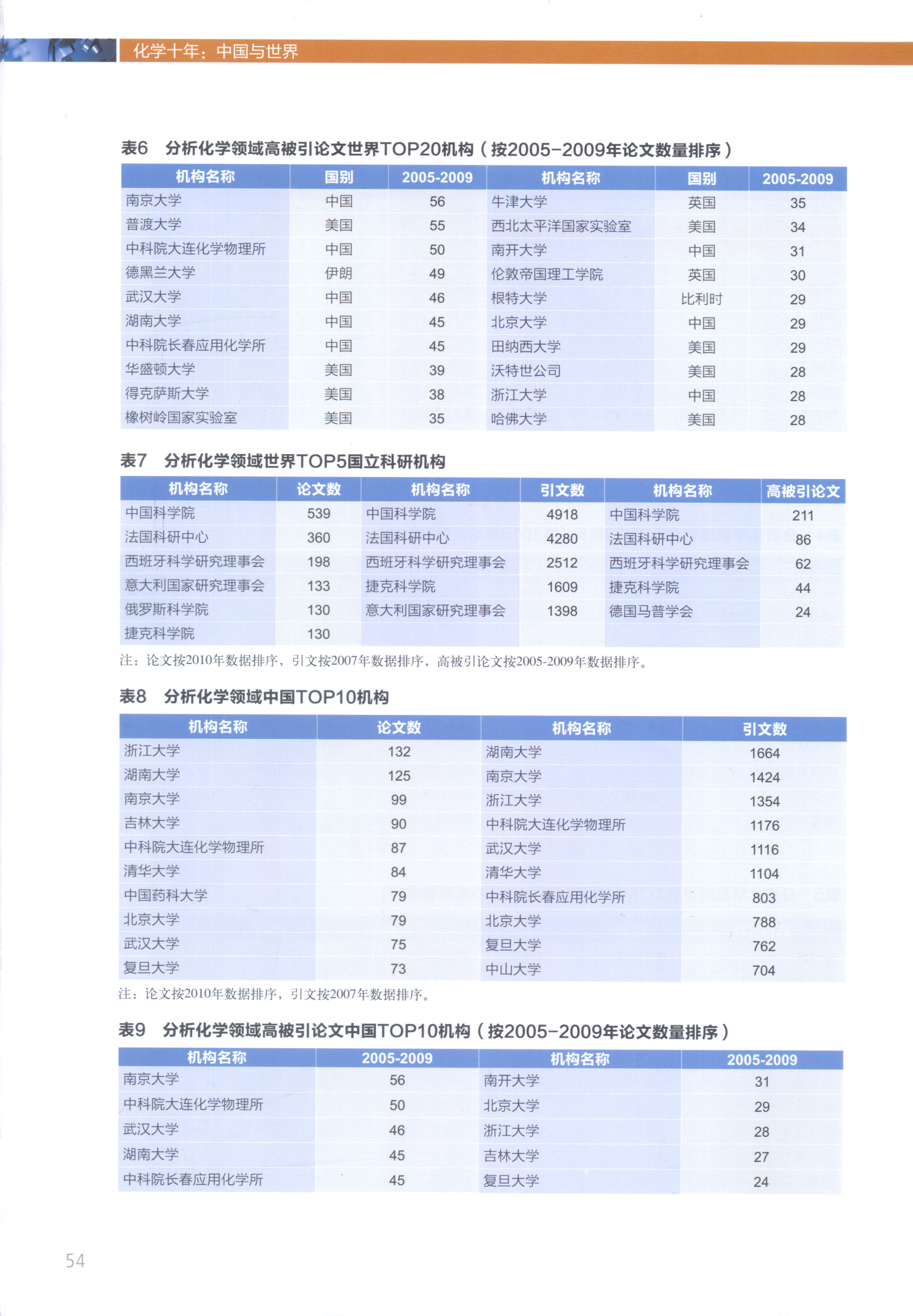 根据该报告中评估结果显示,我校分析化学学科在分析化学领域世界TOP20机构按2010年论文数量排序位居世界第二位,按2007年引文数量排序位居世界首位,在其它几项排名中也分列国际和国内前茅(见以下图表)。这一国家层面上的评估结果充分显示我校分析化学学科科研竞争力已进入到世界一流水平行列。