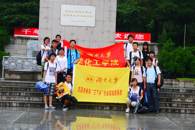 此次活动的目的地是湖南省邵阳市隆回县七江乡,在体验农村生活,感受乡土气息之外,借助学科优势,将对当地水质、土质环境进行监测评估,并且对即将召开的党的十八大进行宣传。微微细雨打不湿同学们的热情与笑容。大家环绕在院旗和“三下乡”旗帜周围合影留念,踏上征程。