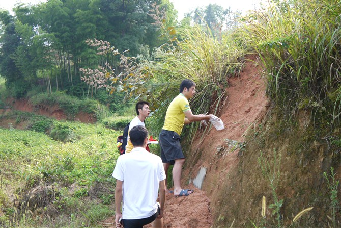 本次样本采集过程中,志愿者们共收集土壤样本2份,水样本2份,金银花样本1份。在随同领导的指引下,志愿者首先来到七江乡大虎坪,采集水样,旨在对水源中微量元素含量进行检测。据随行领导干部介绍,当地居民经常去那里采水回去直接饮用,而且不论天气多么恶劣,那里的水长年流出,清澈见底,当地政府希望我们科学检测水质,以便决定是否将其开发作为居民饮用水。此外,志愿者还赶往了当地棉花园村,对村内的水库也进行了水样采集,一并进行水质检测。