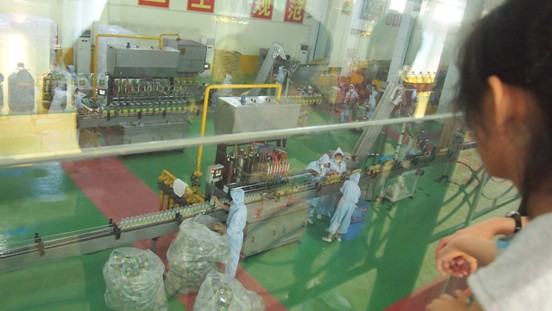 最后来到了也是生产的最后一步工序---灌装,透过参观楼道可以看见整个灌装封口等流程。自购原料生产的PET塑料桶经过自动贴签、灌装、印码等过程成为了待出场的成品桶装油。