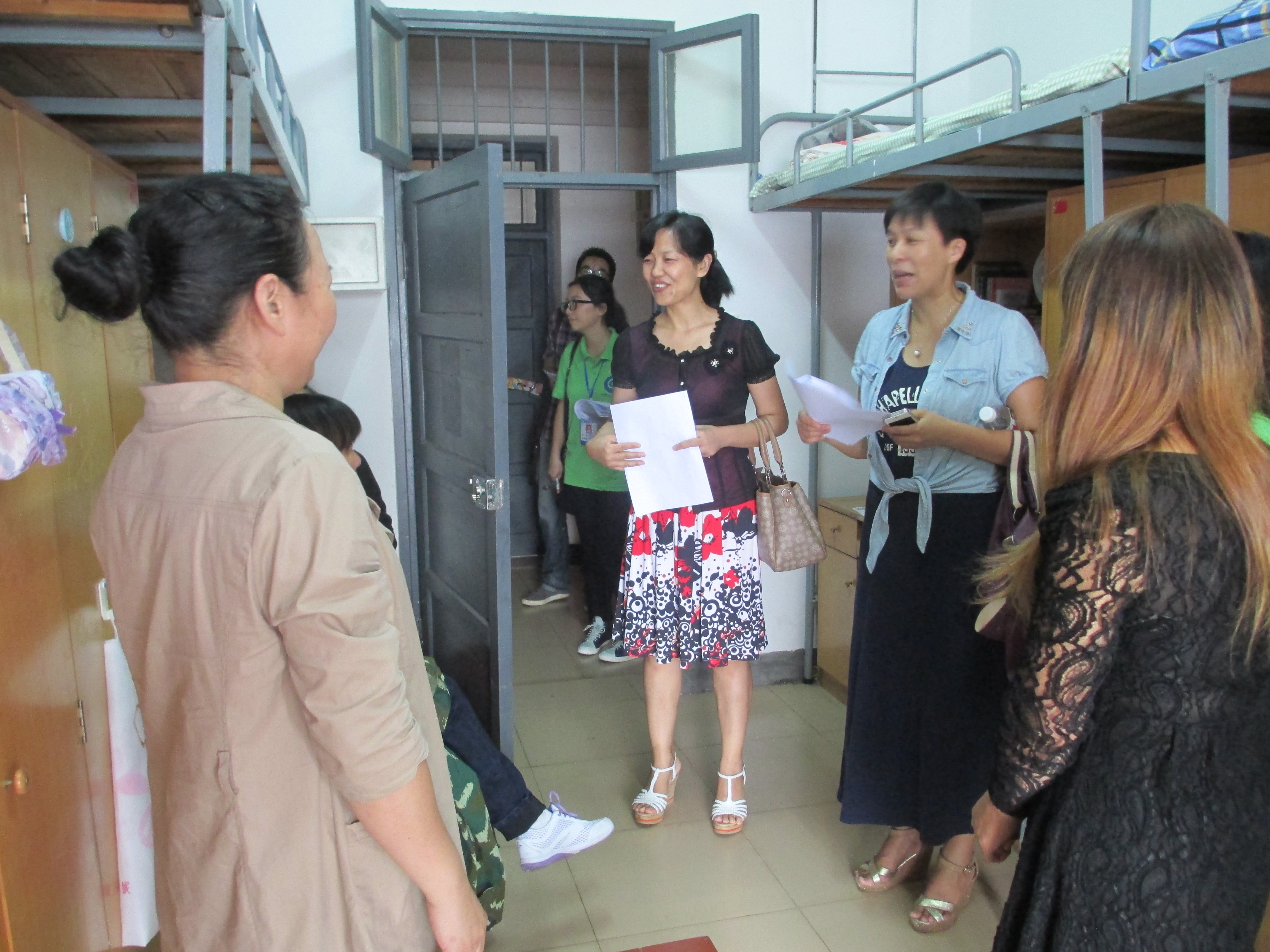 各位领导来到寝室看望新生。学院院长蒋健晖教授,学院党委书记王玉枝教授,学院副院长旷亚非教授、崔坤在教授,学院党委副书记陈义红老师等领导一行分成两组分别对男生和女生寝室进行走访慰问。此次陪同领导看望新生的还有学工办主任曾芳老师,分团委书记李辰老师,12级辅导员陈晓晖老师以及各班新生班主任。