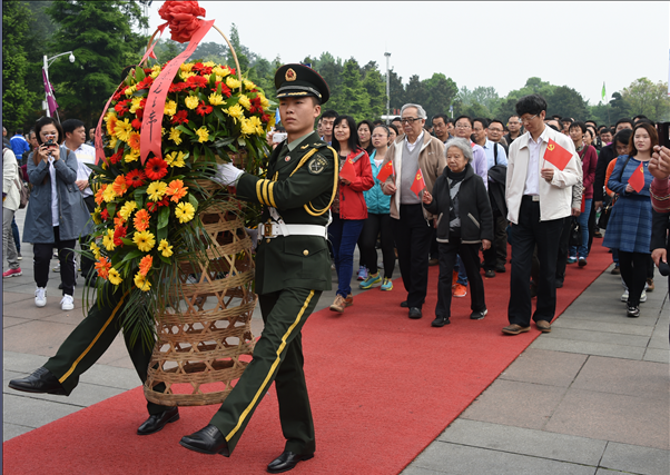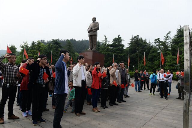 到达韶山后,全体党员首先来到了毛主席铜像广场向毛泽东同志铜像敬献花篮,随着激昂的音乐响起,威武的武警礼兵迈着坚定有力的正步,护送着花篮走向毛泽东同志铜像,俞汝勤院士和王玉枝书记上前整理花篮飘带,全体党员向主席铜像三鞠躬致敬并绕铜像一周。在铜像右侧,全体党员庄严地举起右手,再次重温了入党誓言:“……对党忠诚,积极工作,为共产主义奋斗终身。”无论是有几十年党龄的老同志还是刚刚入党的新党员,在共同信念的激励下,心中激荡着同样的豪情,每个人的思想都得到一次新的洗礼和精神的升华。敬献花篮仪式结束后,全体教职工党员怀着崇敬的心情先后参观了毛泽东纪念馆、毛泽东专题馆、毛泽东故居和滴水洞。通过现场亲历,党员们共同回顾老一辈无产阶级革命领导人的丰功伟绩,深刻感受伟人的崇高革命情怀。