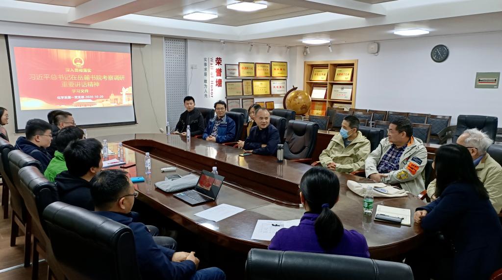 为深入领会、贯彻落实“习近平总书记考察调研湖南大学重要讲话精神”,化学系第一党支部于10月20日下午4:30在新化工楼D区204会议室召开学习研讨会,支部全体党员参加,张晓兵院长、王玉枝书记、俞汝勤院士出席。