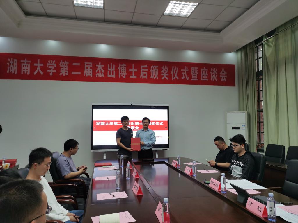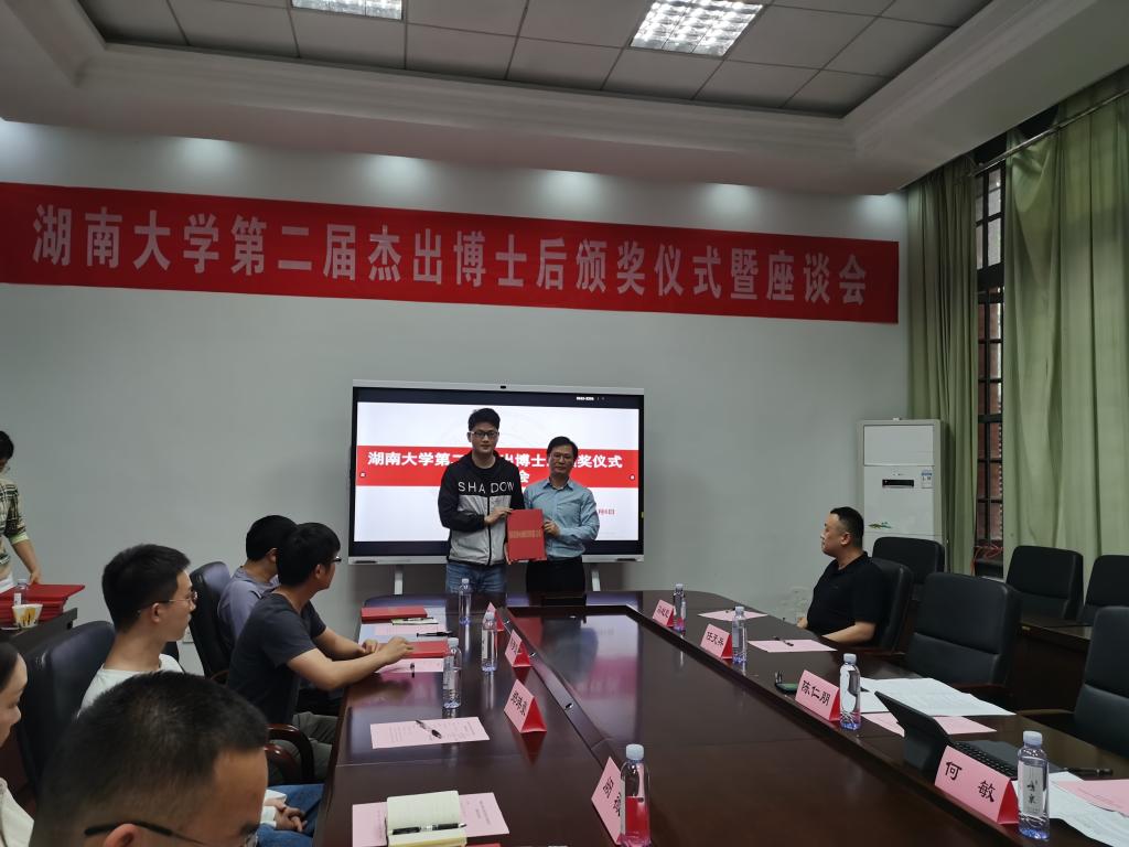 5月6日下午,我校举行第二届杰出博士后颁奖仪式暨座谈会。全校共有17人荣获湖南大学第二届杰出博士后称号,我院熊梦仪、任天兵、彭瑞资三位博士后入选。校长助理、人力资源处处长陈仁朋参加座谈。